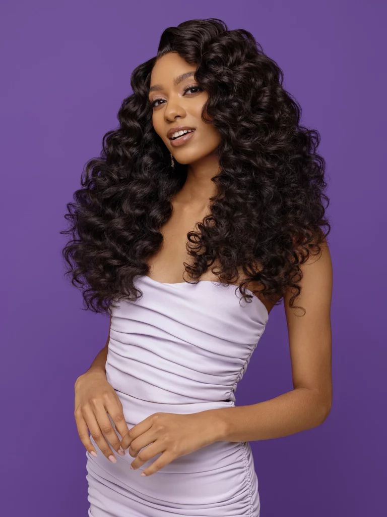 Les boucles sont riches, régulières et rebondies, avec une profondeur visuelle marquée qui crée un volume élégant sans effet “kinky” ni rétractation excessive. Le rendu est glamour, dense et sophistiqué, tout en conservant une longueur visible et un mouvement fluide.